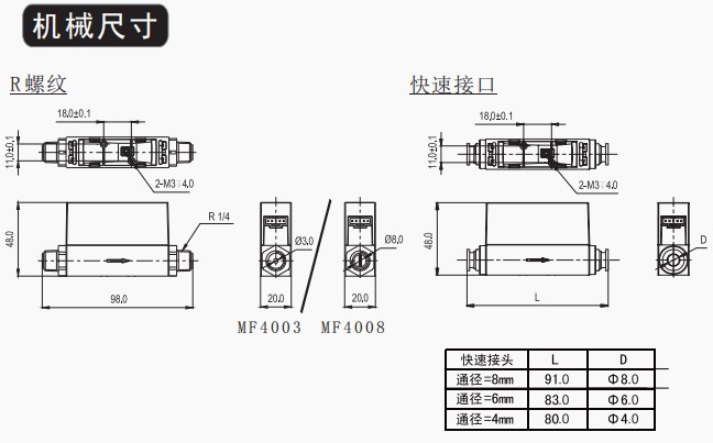 MF4000系列氣體質量流量計是專為管徑為3mm~8mm的氣體管路中的低速氣流的流量計量而設計。螺紋與各種快速
