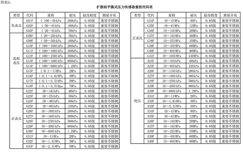 壓力范圍: 表壓:-0.1MPa~0~...~260MPa差壓:0~500Pa~...~3.5MPa絕壓:0~0.035MPa~...~60MPa